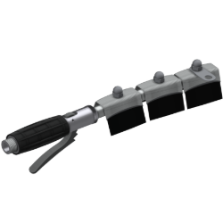Handbürste mit Hebelventil, Sprührohr mit 3 getrennt montierten Bürsten-Elementen, mit Anschlussschlauch DN 8, G 1/2, Länge 1400 mm und Verdrehsicherung. Betriebsdruck 2-6 bar Volumenstrom 0,30 l/s (bei 3 bar)