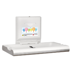 CAMBRINO Baby-Wickeltisch horizontal für Wandmontage, aus Polypropylen mit antibakteriellem Biocote®-Schutz, Farbton Weiß, Frontplatte aus Edelstahl, klappbar, mit integriertem Stoßdämpfer für sicheres Öffnen und Schließen, Nylon-Sicherheitsgurt und Haken an beiden Seiten, abschließbares Spenderfach für Einweg-Papierauflagetücher in Interfold-Faltung mit maximaler Breite 260 mm. Zertifiziert nach EN 12221-1 und EN 12221-2. Inklusive Befestigungsmaterial und 80 Stück Einweg-Papierauflagetüchern. Abmessungen geschlossen 860 x 565 x 100 mm (B x H x T) Abmessungen geöffnet 860 x 480 x 570 mm (B x H x T)