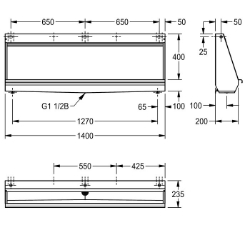 Reihenurinal, zur Wandmontage, Chromnickelstahl V4A, Oberfläche innen und außen seidenmatt, Materialstärke 1,0 mm, Spülwasserbedarf 0,15 l/sm, mit verdecktem Spülrohr, Rinne mit beiderseitiger Neigung zu mittigem gestanzten Siebablauf G 1 1/2 B zum Anschluss an bauseitigem Siphon, inklusive Befestigungsset und Wasseranschluss. Abmessungen 1400 x 515 x 235 mm (B x H x T)