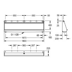 Reihenurinal, zur Wandmontage, Chromnickelstahl V4A, Oberfläche innen und außen seidenmatt, Materialstärke 1,0 mm, Spülwasserbedarf 0,15 l/sm, mit verdecktem Spülrohr, Rinne mit beiderseitiger Neigung zu mittigem gestanzten Siebablauf G 1 1/2 B zum Anschluss an bauseitigem Siphon, inklusive Befestigungsset und Wasseranschluss. Abmessungen 1800 x 515 x 235 mm (B x H x T)