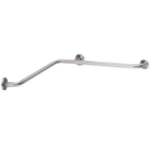 Wandhandlauf für Ecken mit waagrechter Stangenführung, für Aufputzmontage, Chromnickelstahl, Oberfläche seidenmatt, Schliff mit rutschhemmender Wirkung, Rohrdurchmesser 32 mm, Wandstärke 1,2 mm, Wandabstand 82 mm, geprüft und zertifiziert (LGA), mit drei Edelstahl Rosetten für verdeckte Montage, inklusive Edelstahlschrauben und Dübel. Befestigung nur für Beton-Mauerwerk geeignet. Abmessungen 726 x 78 x 726 mm (B x H x T)