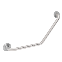 Winkelgriff 135° für Aufputzmontage, Chromnickelstahl, Oberfläche seidenmatt, Schliff mit rutschhemmender Wirkung, Rohrdurchmesser 32 mm, Materialstärke 1,2 mm, Wandabstand 82 mm, geprüft und zertifiziert (LGA), mit zwei Edelstahl Rosetten für verdeckte Montage, inklusive Edelstahlschrauben und Dübel. Befestigung nur für Beton-Mauerwerk geeignet. Abmessungen 696 x 334 x 82 mm (B x H x T)