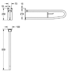 Stützklappgriff mit WC-Rollenhalter für Aufputzmontage, Chromnickelstahl, Oberfläche seidenmatt, Schliff mit rutschhemmender Wirkung, Rohrdurchmesser 32 mm, Wandstärke 1,2 mm, in Bügelform, mit WC-Rollenhalter, Schutz gegen ungewolltes Herunterklappen, Anschlagdäm pfer aus Gummi, geprüft und zertifiziert (LGA), 4 mm starke Montageplatte mit drei Befestigungslöchern, inklusive Edelstahlschrauben und Dübel. Befestigung nur für Beton-Mauerwerk geeignet. Abmessungen 100 x 250 x 850 mm (B x H x T) Entsprechend Norm ÖNORM B 1600:2017 (Griff ragt hochgeklappt max. 20 cm in den Raum)