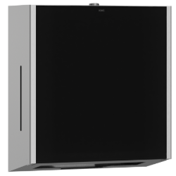 Papierhandtuchspender für Aufputzmontage, Chromnickelstahl, Oberfläche seidenmatt, Front schwarzes ESG-Glas, Gehäuse mit InoxPlus Ob erflächenveredelung zur Reduzierung von Fingerabdrücken und besseren Reinigungseigenschaft (easy to clean), Materialstärke 1,2 mm, seitliche Sichtfenster, Fassungsvermögen 300 - 400 Stück bei Papier mit Z-Faltung, inklusive Befestigungsmaterial. Abmessungen 300 x 325 x 120 mm (B x H x T)