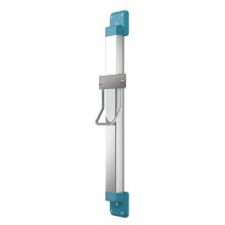 Höhenverstellung für F5 Hauben-Haartrockner, zur Wandmontage, 600 mm stufenlos verstellbar, mit Konstantkraft-Rollbandfeder, Führungsschiene aus eloxiertem Aluminium, mit 4 mm starkem Kristallspiegel, vollflächig verklebt, verdeckter, vandalismushemmender Kabelführung, Farbkombination Silber/Endkappen Perlenzian. Abmessungen 250 x 1200 x 140 mm (B x H x T)