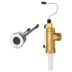 F5E WC-Spülarmatur DN 20 in Kombinationsbauweise für Hinterwandinstallation, opto-elektronisch gesteuert. Mit rundem Sensor (Durchmesser 55 mm), mit integrierter Steuerelektronik und Reinigungsabschaltung, Messing poliert verchromt, von hinten zu verschrauben, mit Verdrehsicherung, Magnetdruckspüler mit Verlängerungskabel für Magnetventil, Länge 5 m. Aktivierte Hygienespülung 24 Stunden nach letzter Betätigung und Speicherung von Statistikdaten. Mit Möglichkeit der Parametrierung und Kommunikation über optionale bidirektionale Fernbedienung. Wahlweise für Batteriebetrieb mit 6 V Lithium Batterie (CR-P2) je Armatur oder separate Spannungsversorgung über Netzteil 6,75 V / 12 V DC oder AQUA 3000 open Systemzubehör. Batteriefach inklusive Batterie oder Netzteil zuzüglich Verlängerungskabel muss separat bestellt werden.