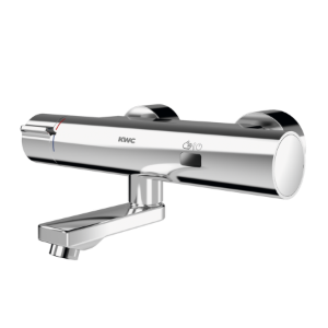 F5E-Therm Thermostat-Wandbatterie DN 15 zur Aufputzmontage mit arretierbarem Schwenkauslauf, für Waschanlagen. Opto-elektronisch ges teuert, Auslösung über Handreflexion. Thermostat mit Metallgriff mit einstellbarem und verdrehsicherem Temperaturanschlag. Mit Möglichkeit der thermischen Desinfektion, manuell oder automatisch über vormontierte Desinfektionseinheit. Zum Anschluss an Warm- und Kal twasser. Steuerelektronik, Magnetventilkartusche und Sensor im verbrühungssicheren Safe-Touch-Gehäuse, Messing poliert verchromt. Laminarstrahlregler mit integriertem Durchflussmengenregler 6,0 l/min. Mit verstellbaren und absperrbaren Anschlüssen mit Rückflussverhinderern und Sieben, vollständig abgedeckt durch tiefenverstellbare Schraubrosetten. Ausladung 275 mm. Aktivierte Hygienespülung 24 Stunden nach letzter Betätigung, Sicherheitsabschaltung bei Dauerreflexion und Speicherung von Statistikdaten. Mit Möglichkeit der Parametrierung und Kommunikation über optionale bidirektionale Fernbedienung. Separate Spannungsversorgung über Netzteil 6,75 V / 12 V DC oder AQUA 3000 open Systemzubehör.