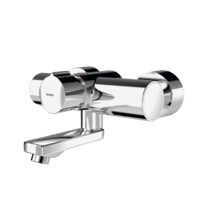F5S-Mix Selbstschluss-Wandbatterie DN 15 als Eingriffmischer zur Aufputzmontage mit arretierbarem Schwenkauslauf, für Waschanlagen. FRAMIC Selbstschluss-Mischkartusche, hydraulisch gesteuert, wartungsarm und stagnationsfrei, mit Keramikscheibentechnik, selbsttätig schließend, fließdruckunabhängig durch mediengetrennte Bauart. Fließzeit stufenlos einstellbar. Mit einstellbarem und verdrehsicherem Temperaturanschlag. Zum Anschluss an Warm- und Kaltwasser. Ganzmetallausführung, Messing poliert verchromt. Luftsprudler mit integriertem Durchflussmengenregler 3,0 l/min. Mit verstellbaren und absperrbaren Anschlüssen mit Rückflussverhinderern und Sieben, vollständig abgedeckt durch tiefenverstellbare Schraubrosetten. Ausladung 135 mm.