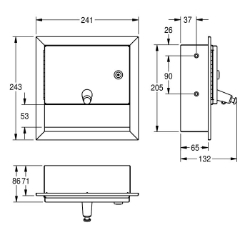 Seifenspender, für Unterputzmontage, Chromnickelstahl, Oberfläche seidenmatt, Materialstärke 0,8 mm, gekantete Front mit Druckknopf für Betätigung von vorne, Zylinderschloss mit KWC Einheitsschlüssel, geeignet für Flüssigseife und Lotionen, 1-Liter-Nachfüllbehälter, inklusive Edelstahlschrauben und Dübel. Abmessungen 241 x 243 x 132 mm (B x H x T)