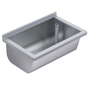 SIRIUS Waschtrog für Wandmontage, Chromnickelstahl, Oberfläche seidenmatt, Materialstärke Waschtrog 0,8 mm / Seitenpaneele 1,2 mm, S eitenpaneele mit integrierten Wandkonsolen, fugenlos verschweißt, Frontschürze mit Längsriffel, ohne Armaturenbank, ohne Überlauf, mit grauem Kunststoffrahmen, 43 mm Wandzarge, Ablauf rechts, Standrohrventil G 1 1/2 B aus Kunststoff, inklusive Befestigungsmaterial . Abmessungen 700 x 328 x 460 mm (B x H x T) Beckenabmessungen 613 x 285 x 398 mm (B x H x T)