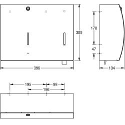Papierhandtuchspender und Seifenspender Kombination, für Aufputzmontage, Chromnickelstahl, Oberfläche seidenmatt, Materialstärke 1,5 mm, Front mit InoxPlus Oberflächenveredelung zur Reduzierung von Fingerabdrücken und mit besseren Reinigungseigenschaften (easy to clean), gebogene Front mit zwei Sichtfenstern, Zylinderschloss mit KWC Einheitsschlüssel, Papierhandtuchspender mit Fassungsvermögen 300 - 400 Stück bei Papier mit Z-Faltung, Seifenspender geeignet für Flüssigseife und Lotionen, 0 ,8-Liter-Nachfüllbehälter, mit Kunststoffdrückerhebel, inklusive Edelstahlschrauben und Dübel. Abmessungen 396 x 305 x 134 mm (B x H x T)