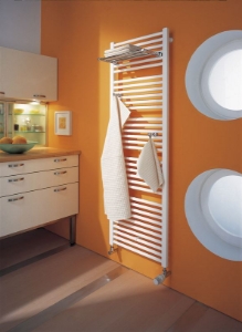 Arbonia Bagnostar Badraumwärmer BST weiss mit geraden, horizontal übereinander angeordneten, runden Präzisionsstahlrohren, mit senkrechten D-förmigen Sammelrohren verbunden. Mit Lücken für das Einhängen von Badetüchern. Lieferumfang (Standardausführung): Inkl. Handtuchbügel (alu lackiert). Für den Anschluss an Warmwasser- Zentralheizung oder gemischten Betrieb. Thermolackierung im Standardton RAL 9016, Montageset inkl. Anleitung, anschlussfertig verpackt. Bautiefe: 35mm.