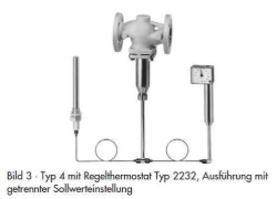 Die Regler arbeiten nach dem Prinzip der Flüssigkeitsausdehnung. Temperaturfühler (12), Verbindungsrohr (9) und Arbeitskörper (7) sind mit einer Flüssigkeit gefüllt. Ausdehnung und Entspannung dieser Flüssigkeit verstellen in Abhängigkeit von der Temperatur am Fühler den Stellbalg im Arbeitskörper (7) und infolgedessen die Kegelstange (5) des Ventils mit dem Kegel (3). Die Stellung des Kegels bestimmt den Durchfluss des Wärmeträgers über die zwischen Kegel (3) und Sitz (2) freigegebene Fläche. Der Temperatur-Sollwert wird mit einem Schlüssel (10) auf einen an der Sollwertskala (11) ablesbaren Wert eingestellt.
