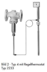Die Regler arbeiten nach dem Prinzip der Flüssigkeitsausdehnung. Temperaturfühler (12), Verbindungsrohr (9) und Arbeitskörper (7) sind mit einer Flüssigkeit gefüllt. Ausdehnung und Entspannung dieser Flüssigkeit verstellen in Abhängigkeit von der Temperatur am Fühler den Stellbalg im Arbeitskörper (7) und infolgedessen die Kegelstange (5) des Ventils mit dem Kegel (3). Die Stellung des Kegels bestimmt den Durchfluss des Wärmeträgers über die zwischen Kegel (3) und Sitz (2) freigegebene Fläche. Der Temperatur-Sollwert wird mit einem Schlüssel (10) auf einen an der Sollwertskala (11) ablesbaren Wert eingestellt.