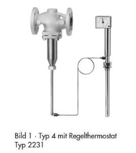 Die Regler arbeiten nach dem Prinzip der Flüssigkeitsausdehnung. Temperaturfühler (12), Verbindungsrohr (9) und Arbeitskörper (7) sind mit einer Flüssigkeit gefüllt. Ausdehnung und Entspannung dieser Flüssigkeit verstellen in Abhängigkeit von der Temperatur am Fühler den Stellbalg im Arbeitskörper (7) und infolgedessen die Kegelstange (5) des Ventils mit dem Kegel (3). Die Stellung des Kegels bestimmt den Durchfluss des Wärmeträgers über die zwischen Kegel (3) und Sitz (2) freigegebene Fläche. Der Temperatur-Sollwert wird mit einem Schlüssel (10) auf einen an der Sollwertskala (11) ablesbaren Wert eingestellt.