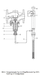 Die Regler arbeiten nach dem Prinzip der Flüssigkeitsausdehnung. Temperaturfühler (12), Verbindungsrohr (9) und Arbeitskörper (7) sind mit einer Flüssigkeit gefüllt. Ausdehnung und Entspannung dieser Flüssigkeit verstellen in Abhängigkeit von der Temperatur am Fühler den Stellbalg im Arbeitskörper (7) und infolgedessen die Kegelstange (5) des Ventils mit dem Kegel (3). Die Stellung des Kegels bestimmt den Durchfluss des Wärmeträgers über die zwischen Kegel (3) und Sitz (2) freigegebene Fläche. Der Temperatur-Sollwert wird mit einem Schlüssel (10) auf einen an der Sollwertskala (11) ablesbaren Wert eingestellt.