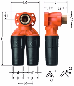 | Rp | d | d1 | L | L1 | L2 | L3 | L4 | H | H1 | D | D1 | ζ1 | ζ2 | Grösse | Art.-Nr. | VE | suissetec |